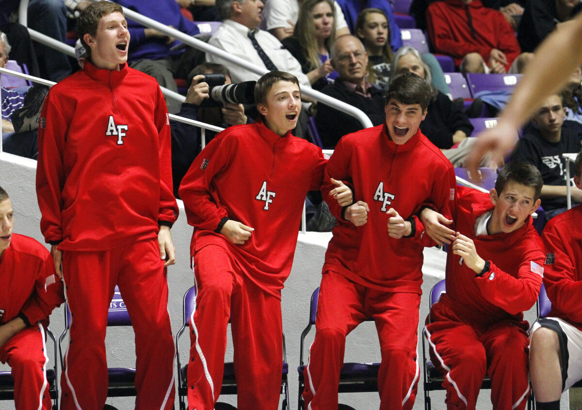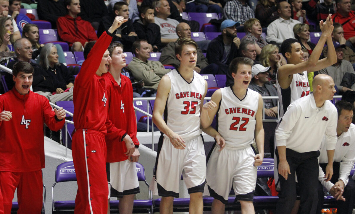 American Fork players celebrate a play in the last seconds of the 5A quarterfinal game against Syracuse at the Dee Events Center in Ogden on Wednesday, February 27, 2013. American Fork won the game. SARAH WEISER/Daily Herald