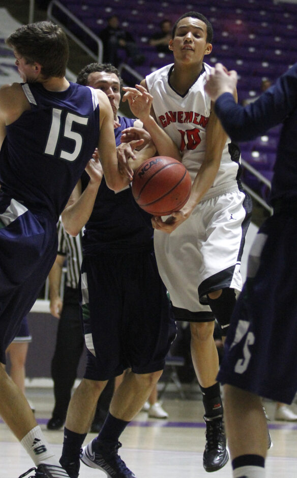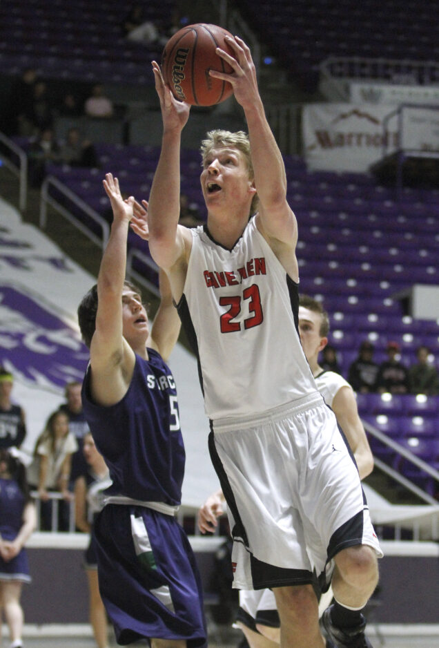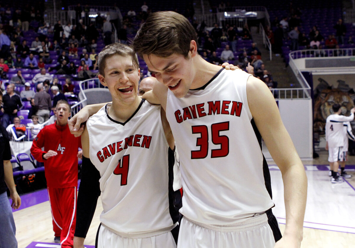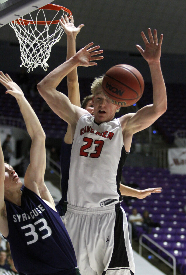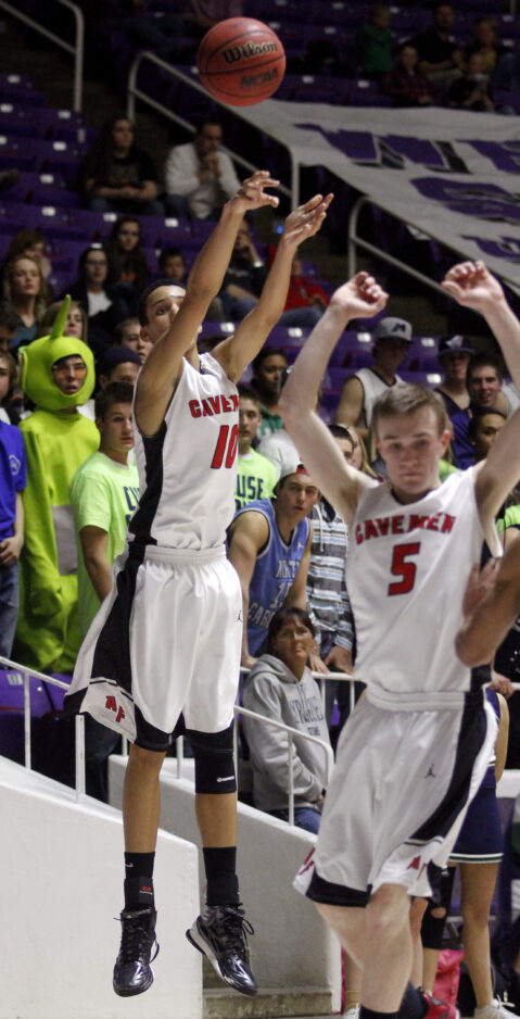With the score tied at 37, the Caveman called a timeout and set up a play. With the American Fork guards being hounded by the Syracuse defenders near midcourt, the Cavemen inbounds pass went to junior forward Tyler Rawson in the left corner, who lobbed the ball inside to Andrus.