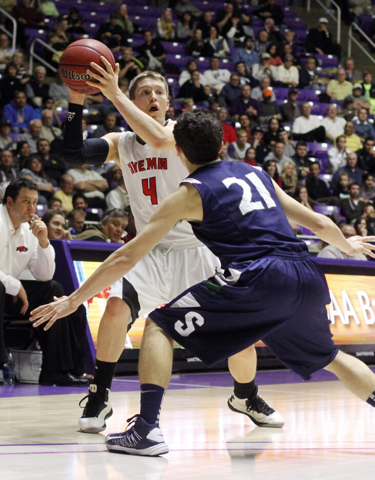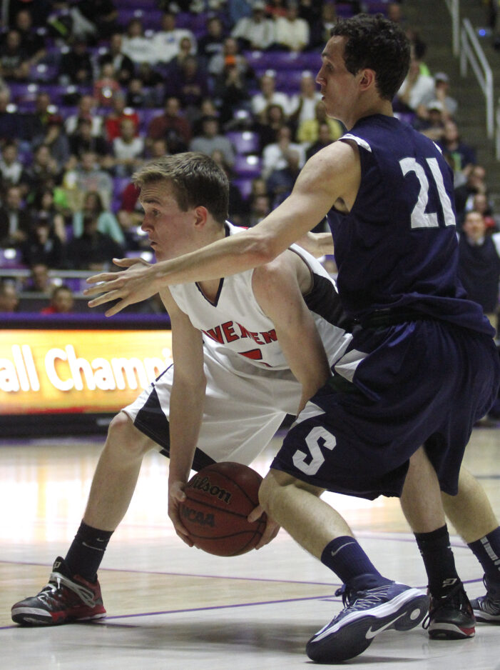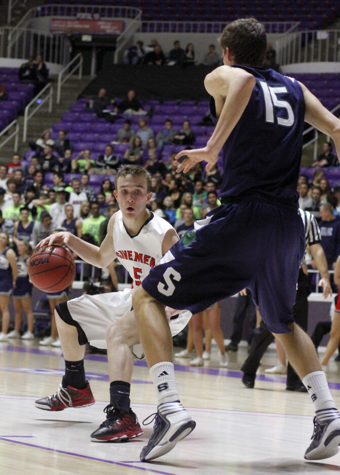 Dan Nyman (4) of American Fork looks for an opening around Michael Phelps (21) of Syracuse during the second half of the 5A quarterfinal game at the Dee Events Center in Ogden on Wednesday, February 27, 2013. American Fork won the game. SARAH WEISER/Daily Herald