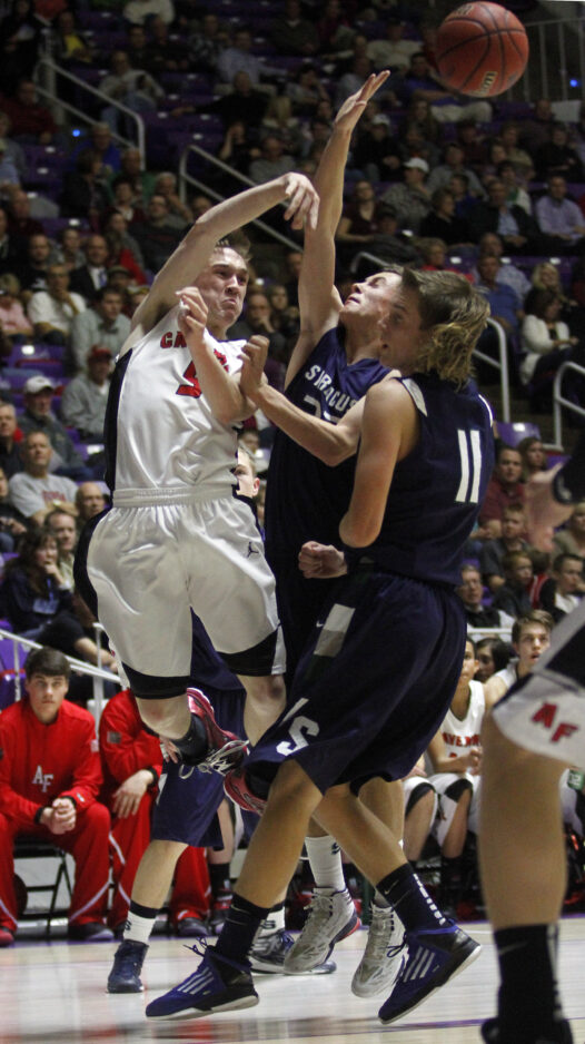 Ryan Andrus (23) of American Fork goes up for a shot around Kade Janes (5) of Syracuse during the first quarter of the 5A quarterfinal game between Syracuse and American Fork at the Dee Events Center in Ogden on Wednesday, February 27, 2013. SARAH WEISER/Daily Herald