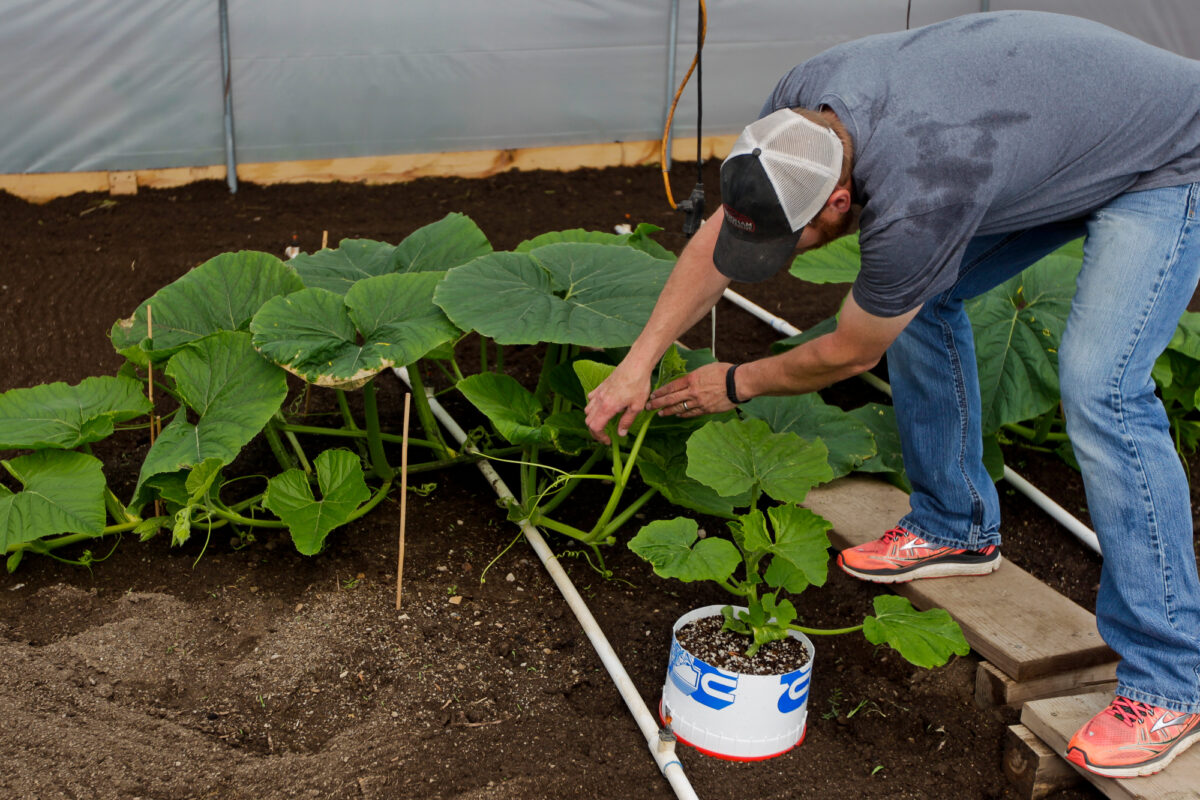 Chad Black lifts the leaves of one of his pumpkin plants in a greenhouse behind his home in American Fork on Thursday, May 22, 2014. Black is growing two Atlantic Giant pumpkins in an attempt to break the state record of 1,600 pounds. SPENSER HEAPS, Daily Herald