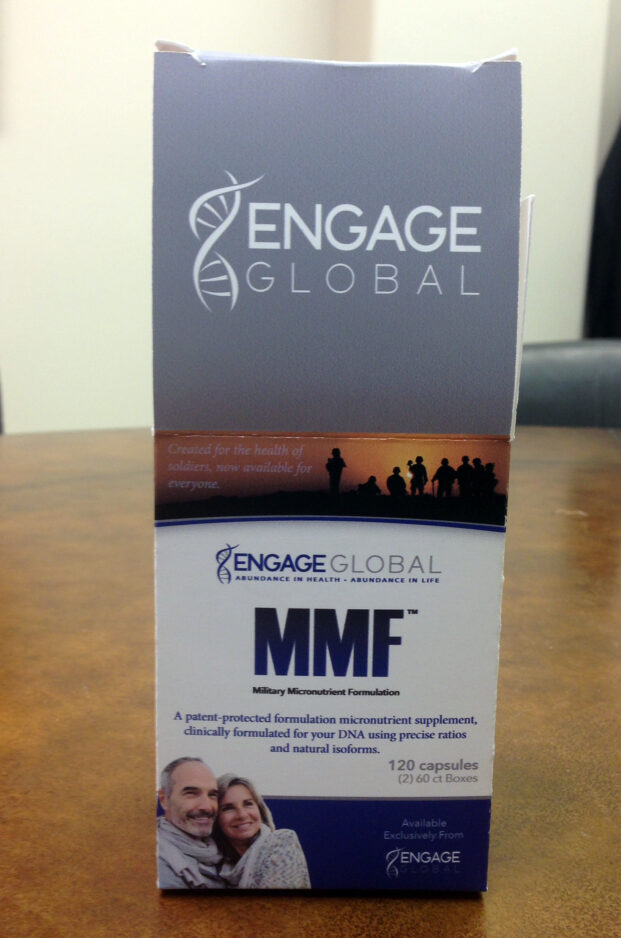 Golly said during that process MMF underwent 10 clinical trials — nine of which were human. When he learned about the supplement, Golly wanted it for civilian use to sell in the private sector. After much passing of time, the company was able to gain an exclusive distribution agreement to procure and make the supplement. The next step involved purchasing the MMF intellectual property. Now Engage Global has redesigned the packaging from its original military use, rebranded the company name, along with its website, and now it’s ready to sell full-force.