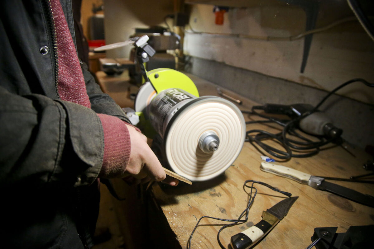 They start off with a completely blank slate; a piece of wood, usually about the size of a pack of gum, that is completely untouched and blank. After some time with the machines buffing, grinding, smoothing, sanding and cutting, a knife handle is done. For the most part. Then the duo has to fit the handle around a blade (which they get from various dealers, as well as from a friend in Ohio who does custom metalwork), and attach the handle to it, and then make sure it’s glued in place.