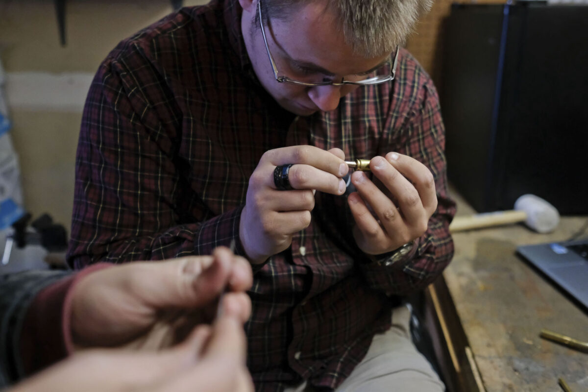 The knives usually take about an hour or so to create, and after fitting the handle with a blade, they have to carefully place brass pins into holes that they’ve precisely drilled in the handles.