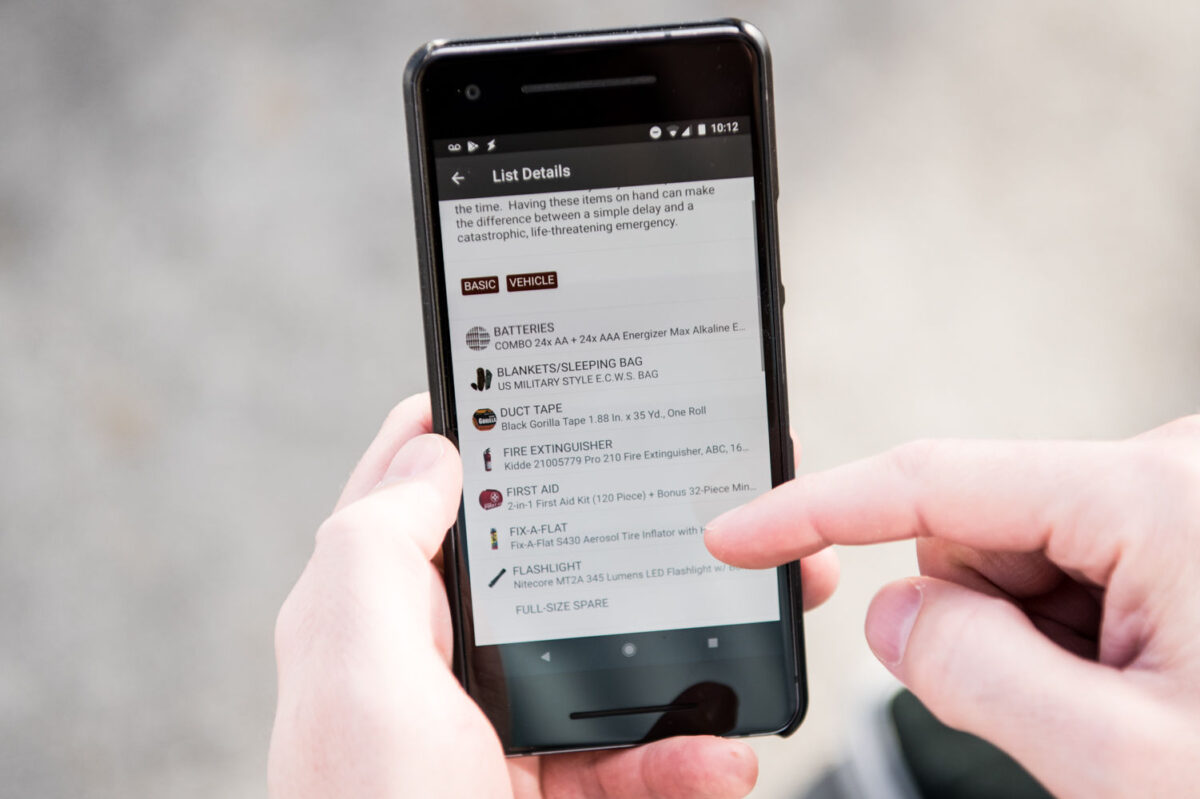 The new app, launched for both Android and iOS in December, categorizes more than 55 different emergency situations — from the need for a simple 72-hour kit to essentials needed to survive a solar storm — and walks users through what items should be on hand for each. As a user purchases those items, he/she can then make notes on where the item is stored, when it expires, and other information.