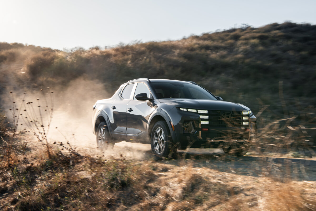 Hyundai’s compact pickup takes on a bold look at sunset, with the Sage Gray Santa Cruz XRT showcasing its distinctive front lighting, raised stance and adventure-ready personality during a week of real-world driving.