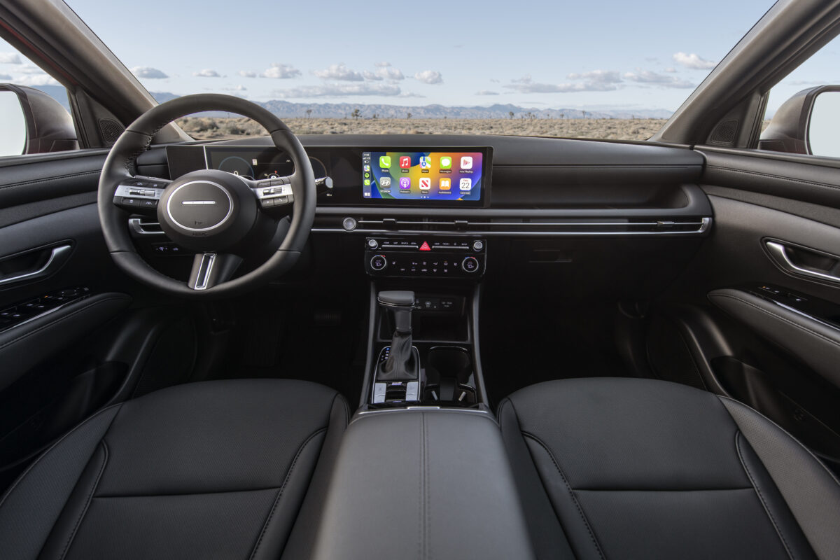 - The 2026 Hyundai Santa Cruz features a completely redesigned dashboard centered around a panoramic curved display. This high-tech setup integrates a 12.3-inch digital instrument cluster and a 12.3-inch infotainment touchscreen into a single, seamless housing. The refreshed center stack also brings back ergonomic physical knobs and switches for climate and audio controls, blending modern digital convenience with tactile ease of use for the driver.
