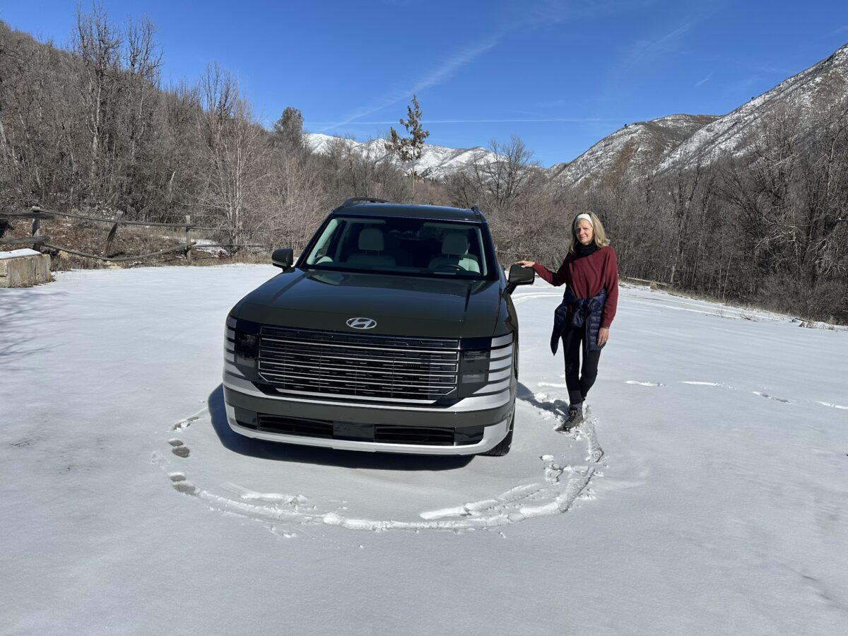 With the snow-dusted peaks of Utah Valley as a backdrop, Deanne stands with the 2026 Hyundai Palisade Hybrid Calligraphy as it shows off its bold, squared-off front fascia. The Titan Charcoal finish provided a sophisticated contrast to the winter landscape during a late February test drive, and after a beautiful Saturday afternoon hike in the hills.