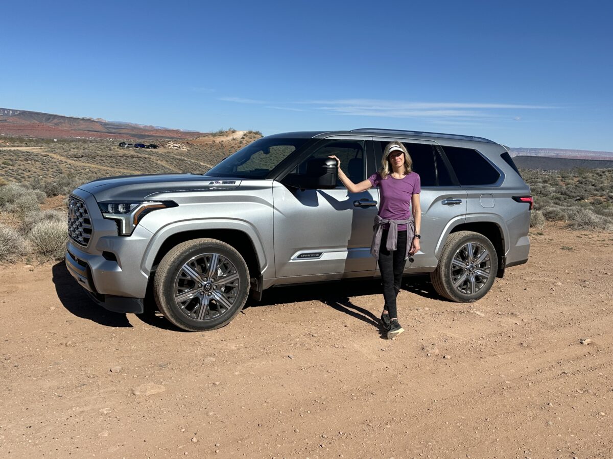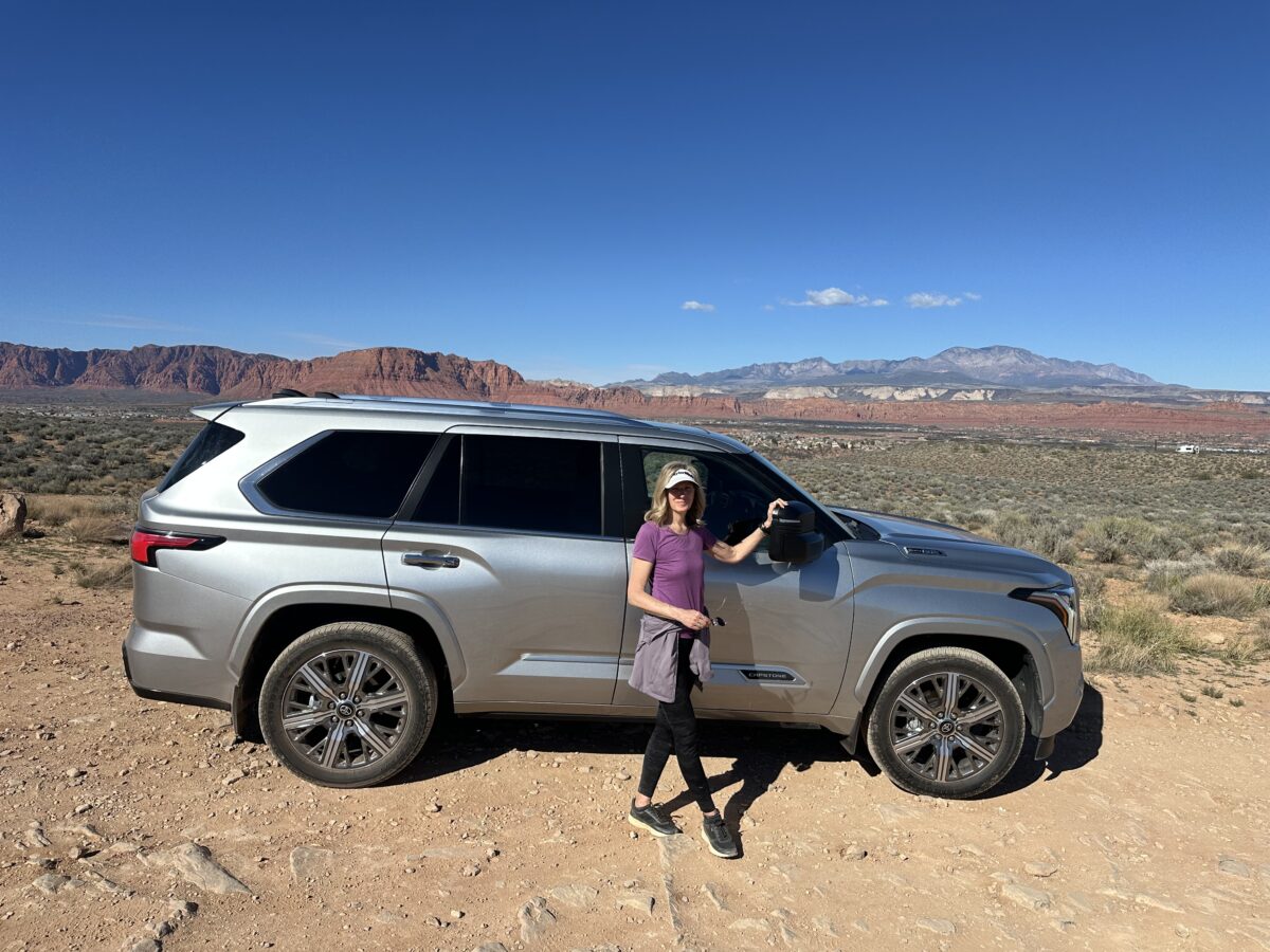 - Deanne with the 2026 Toyota Sequoia Capstone Hybrid as it stands out in a sharp Crystal Silver finish. Its bold front grille and commanding presence made it the perfect companion for a week that balanced daily commutes in Utah Valley with a weekend escape to the red rocks of St. George.