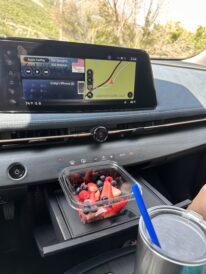 The new Nissan Aryia comes complete with a small shelf we utilized to hold a container of fruit we purchased along our drive.