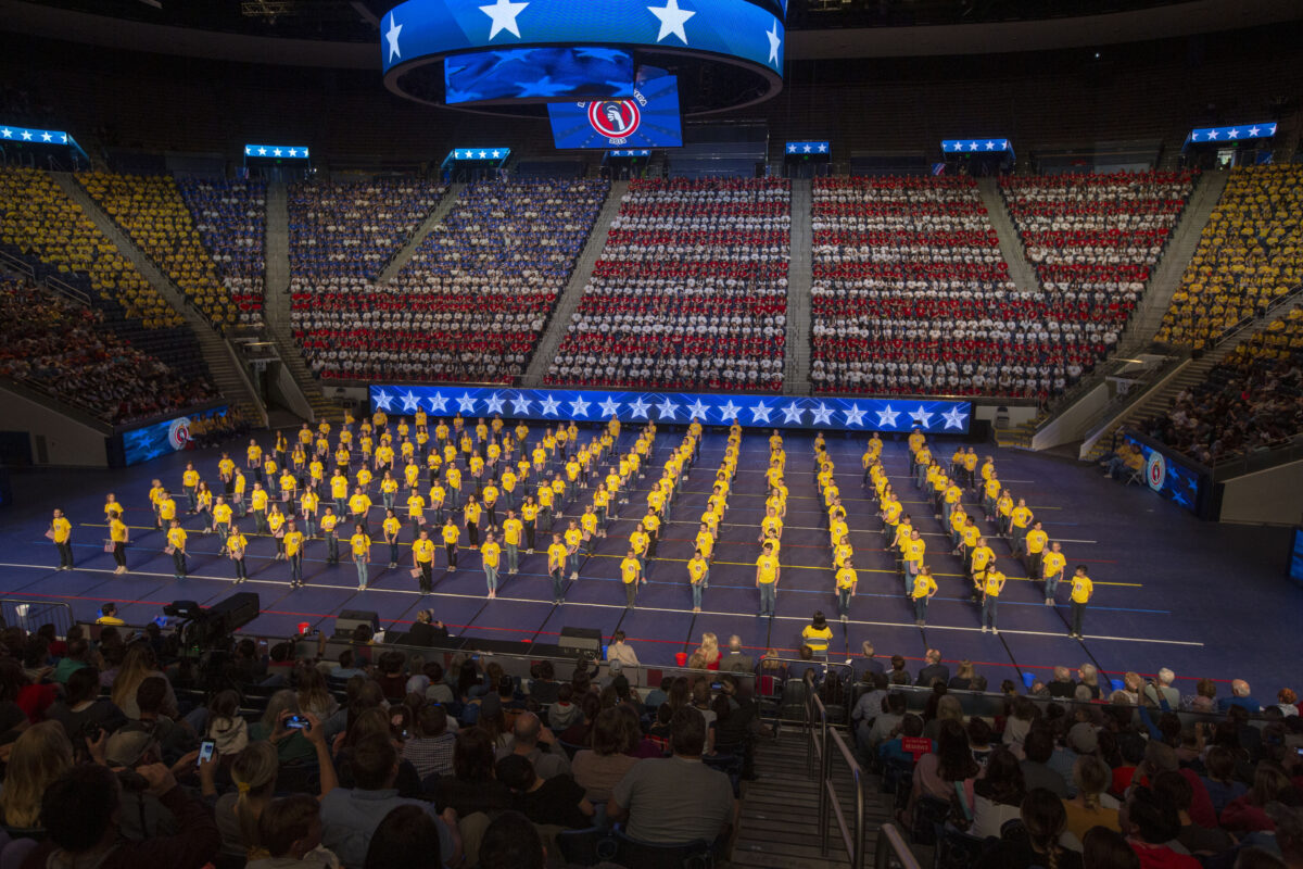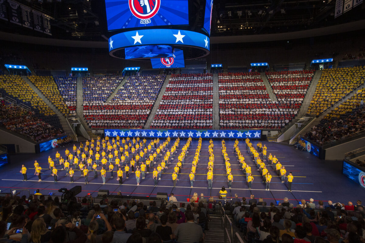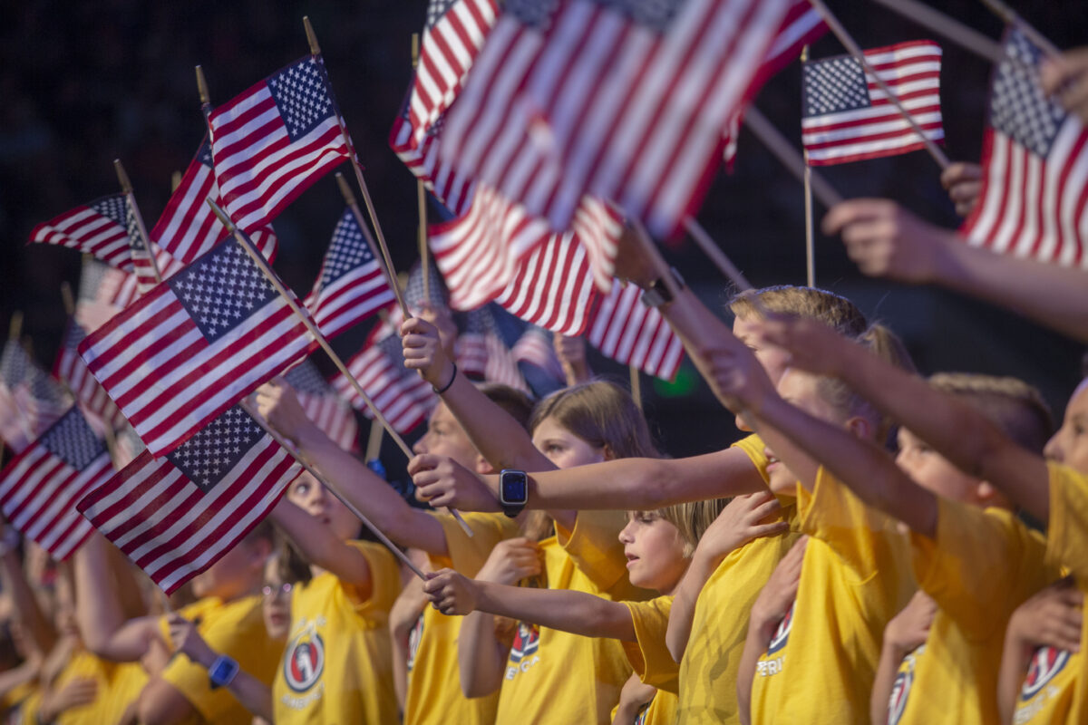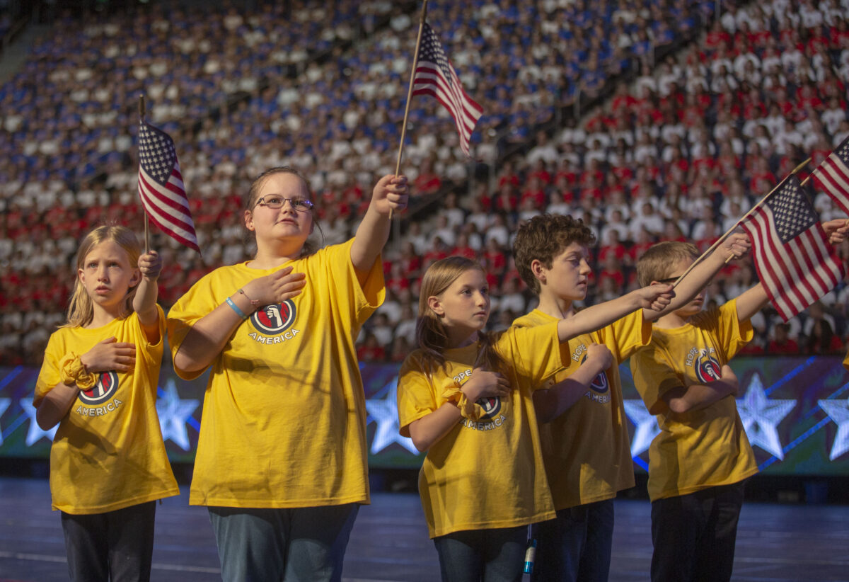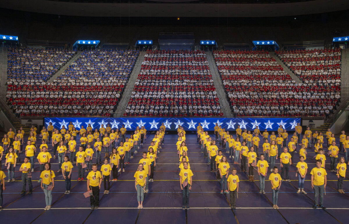 Elementary school children form an American flag at the Hope of America event Thursday, May 8, 2019, at Marriott Center at BYU.