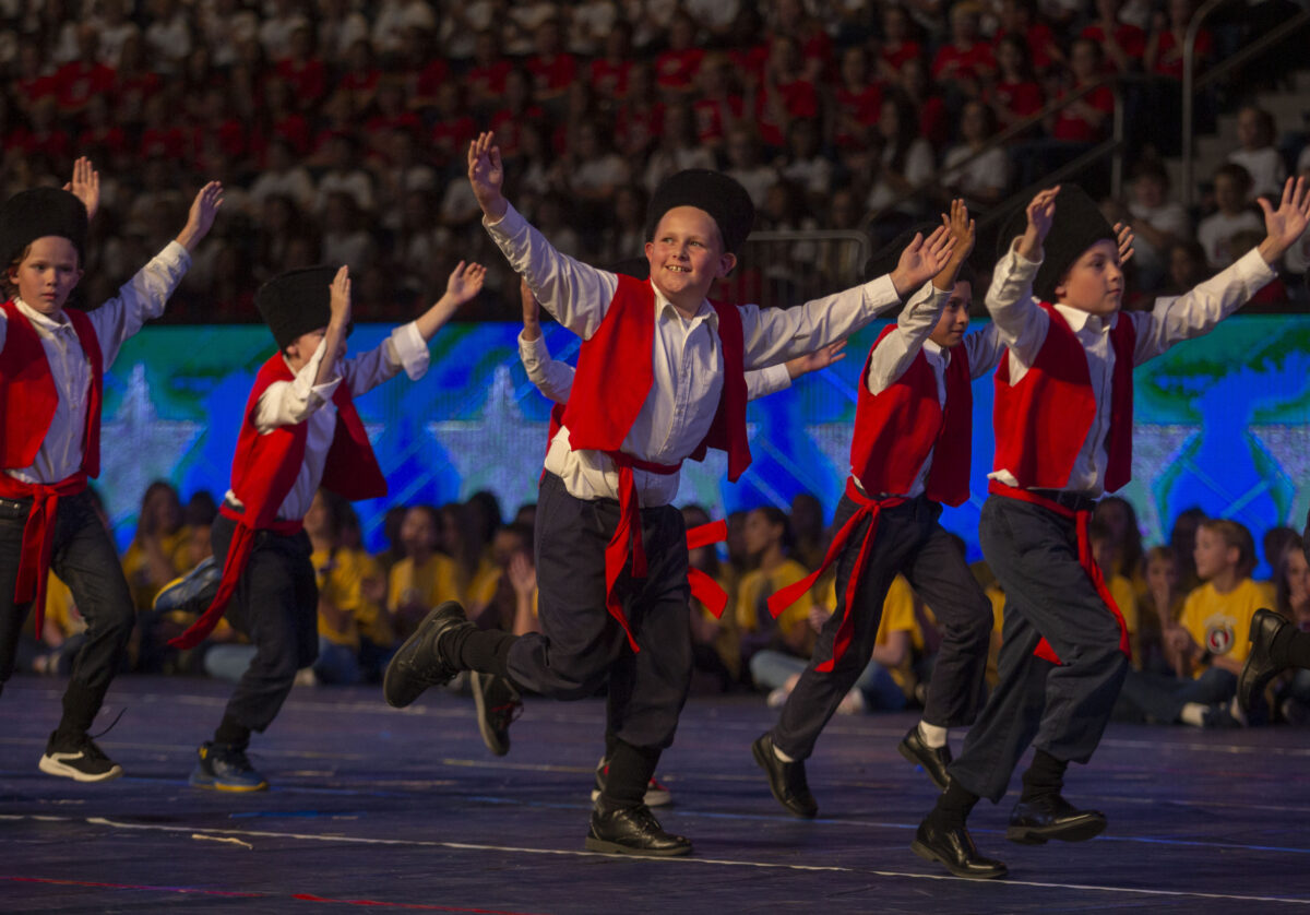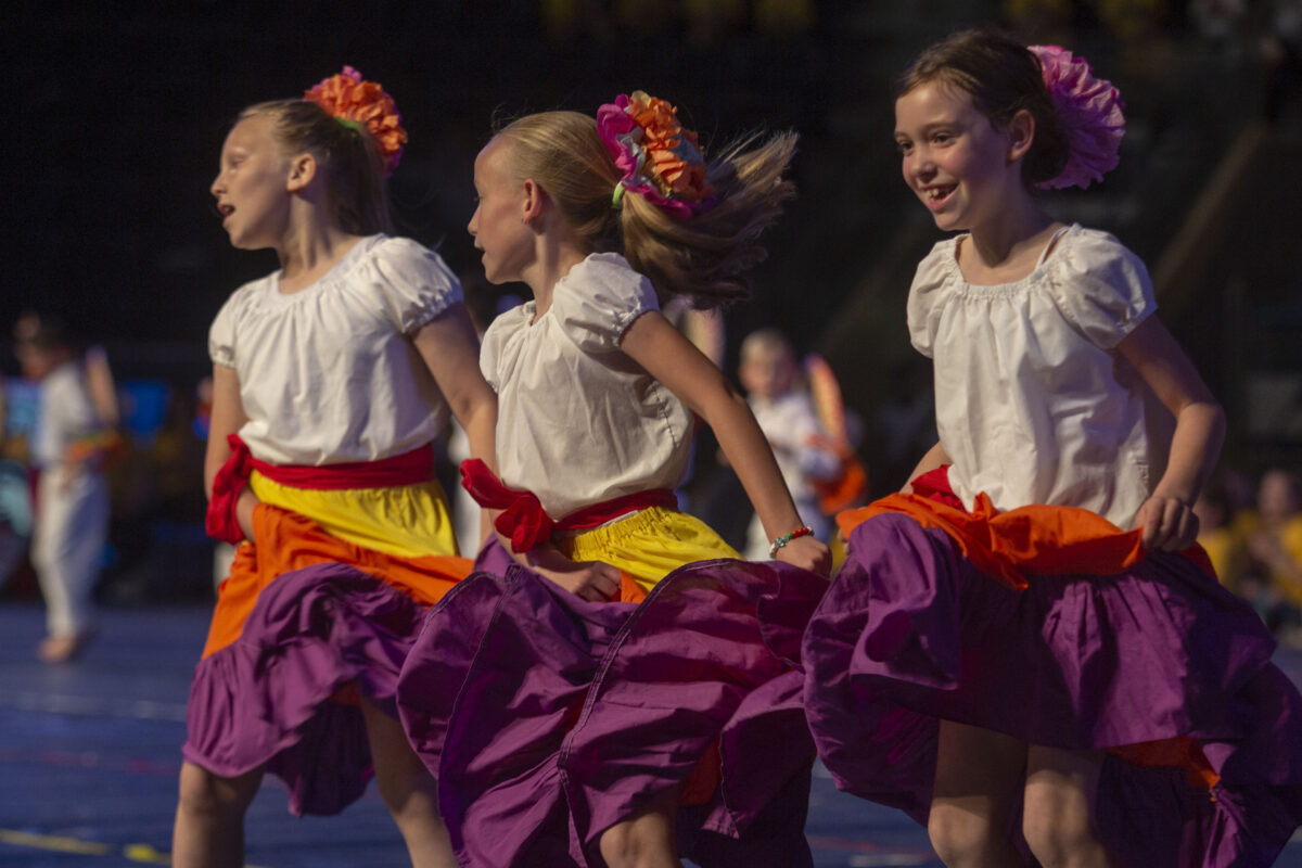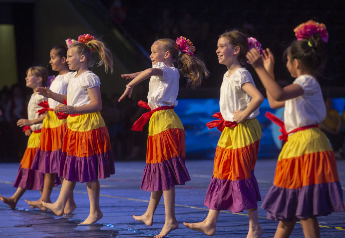 Elementary school children dance in costume in a celebration of immigrants at the Hope of America event Thursday, May 8, 2019, at Marriott Center at BYU. (Photo by Natalie Behring, special to the Daily Herald).