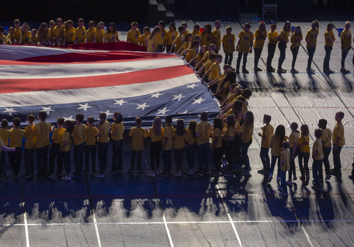 Children unfurl a giant flag during the Hope of America event Thursday, May 8, 2019, at Marriott Center at BYU. (Photo by Natalie Behring, special to the Daily Herald).