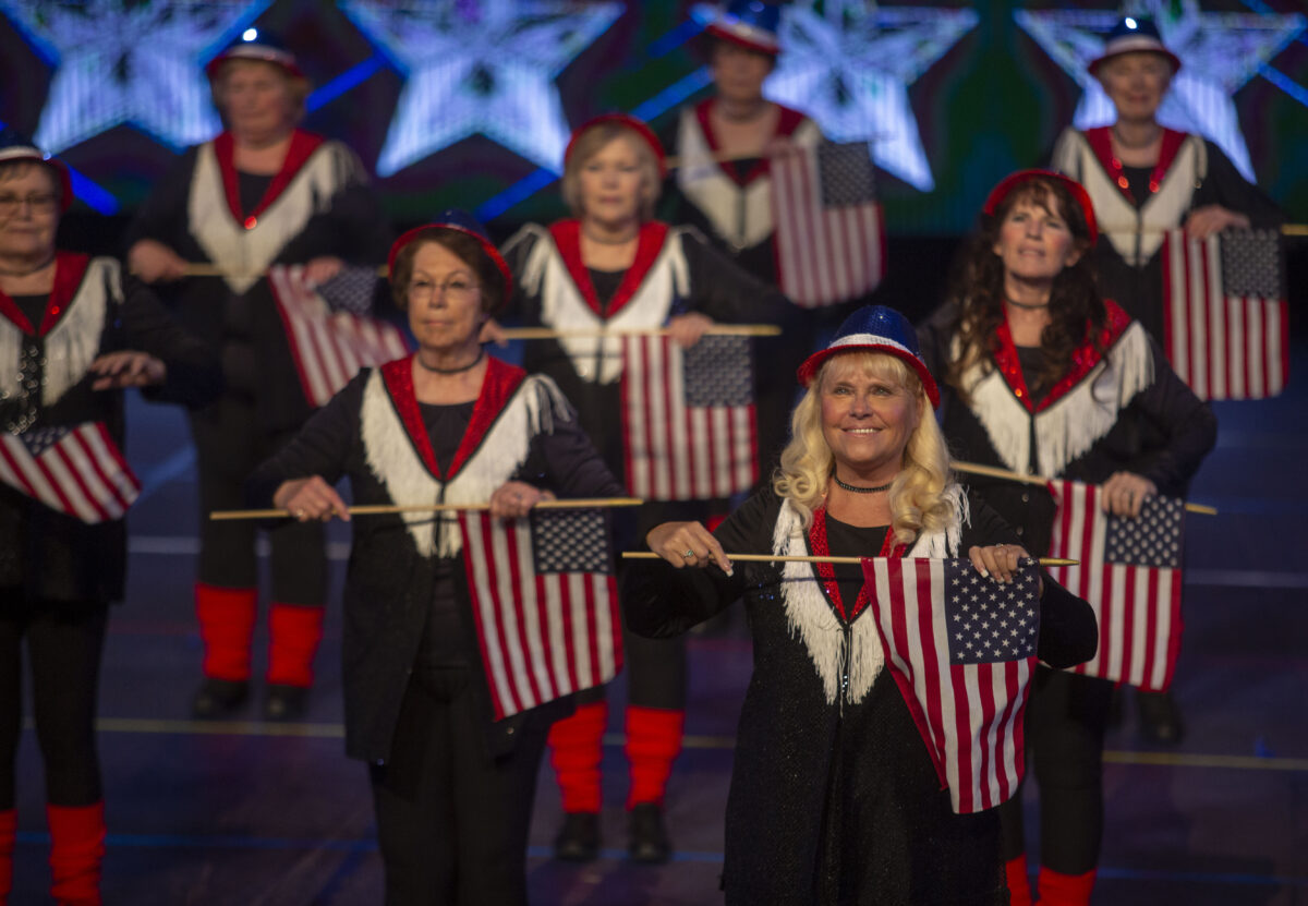 Adult women dance with flags at the Hope of America event Thursday, May 8, 2019, at Marriott Center at BYU. (Photo by Natalie Behring, special to the Daily Herald).