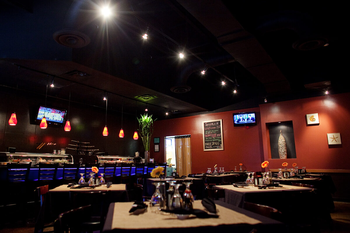 The dining room was a mixture of booths and tables, the majority fitting four comfortably. There were a couple of six-seat tables, a cozy two-seater, and a 10-seat sushi bar. We visited late on a Thursday evening and traffic inside was slow, but we could imagine the place doing brisk business during the lunch and dinner rushes.