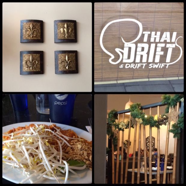 My favorite thing about being part of the Lunch Ladies is the freedom it has given me to branch out and try new foods. When going to Thai restaurants in the past I have always ordered curry, and usually Massaman Curry, which I love. Today, I tried the Pad Thai. Wow! I have been missing out. This is a delicious blend of pan-fried rice noodles, some sort of sauce, eggs, onions topped with the freshest bean sprouts I have ever tasted and roasted peanuts. I added chicken to top off this delicious dish. I could have added beef, pork, tofu or shrimp (add $1 for the shrimp). Thai Drift serves Pepsi products so I ordered water but the food is worth the trip even without Diet Coke.
