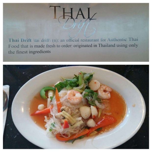 I pretty much enjoy any kind of cuisine and when in a Thai restaurant my go-to entree is usually something, something curry. But today after a quick study of the menu before leaving the office I was intrigued by the sound of this salad: “Mixed veggies, green and red onions and lemon grass, with our Thai Drift sweet and sour dressing and a hint of lime. Seafood contains, shrimp, calamari, mussel, shrimp ball, scallop and fish balls.” When I ordered it, the waitress asked how spicy I would like the dressing. I opted for “kinda,” but not super spicy. Served warm, it was all of the above and more. No bed of lettuce, just a few perfect basil leaves with some glass noodles tossed in. My taste buds were completely satisfied.