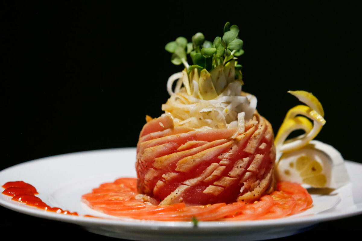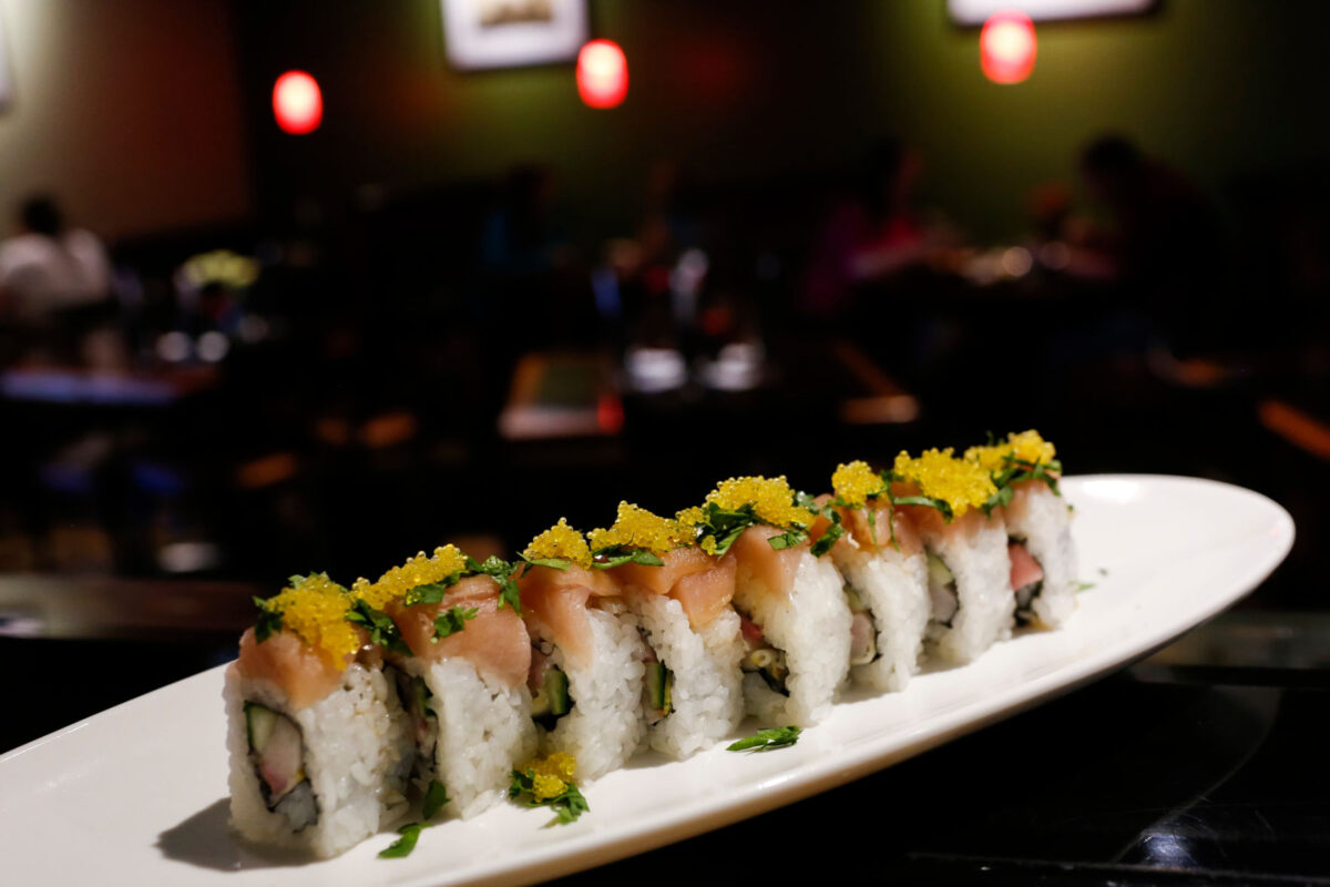Uncooked tuna and salmon are at the core of this roll with crab salad, sprouts and avocado as filler items. It’s also topped with tobiko, or small orange caviar dollops. Another sweet addition was the accompanying ponzu sauce, a soy sauce hinted with lemon citrus — such a nice blend with the cool crunch of the cucumber and creamy-smooth texture of the soft avocado and fish ingredients.
