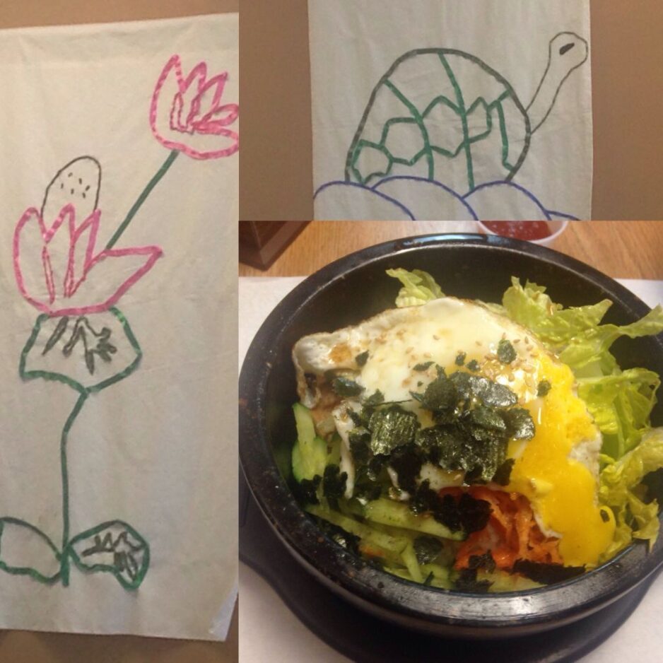 We placed our orders with the friendly waiter and then took in our surroundings a bit more. The small restaurant had a very casual atmosphere that was initially hard to see from the outside due to the blind-covered windows. But now that we were looking around from the inside, we enjoyed noticing the Korean trinkets and cultural items filling the bookshelves in the back of the dining area and the simple ribbon textile artwork hanging on the two main walls. Honestly, the space just felt laid back, and we liked it.