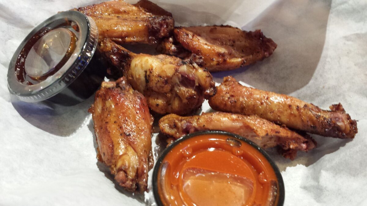 I couldn’t resist trying a half order of Buffalo Wings. They were ordered naked so that we could compare the two accompanying sauces: Buffalo and BBQ. Both were good, but our personal preference was definitely to the BBQ dip. Incidentally, each table includes four squeeze bottles of varying sauce flavors — Original, Carolina, Sweet and Less Sweet, More Heat.
