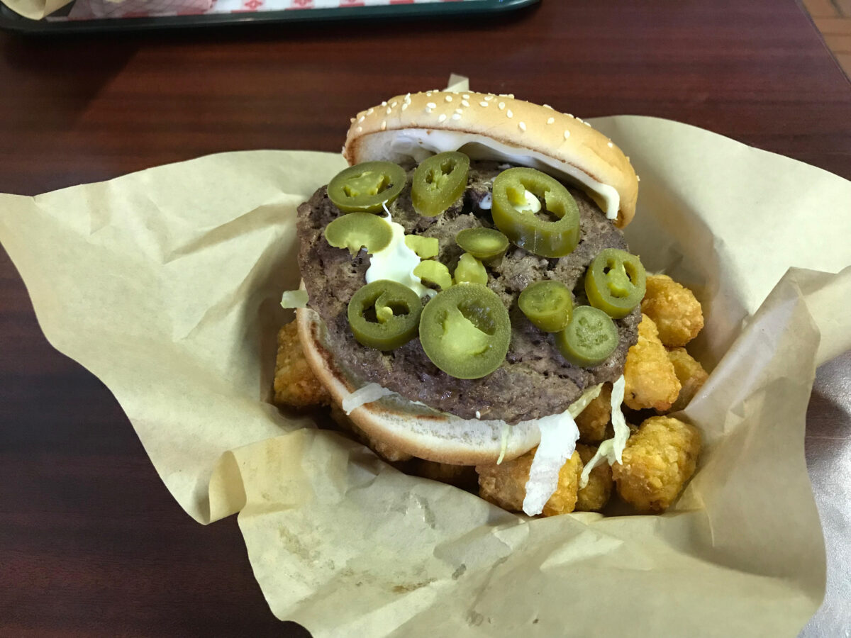 The Jalapeno Burger includes the hamburger patty, lettuce, tomato, onion, mayonnaise and lots of jalapenos. It is all served on a sesame seed bun, and was also a great combo.