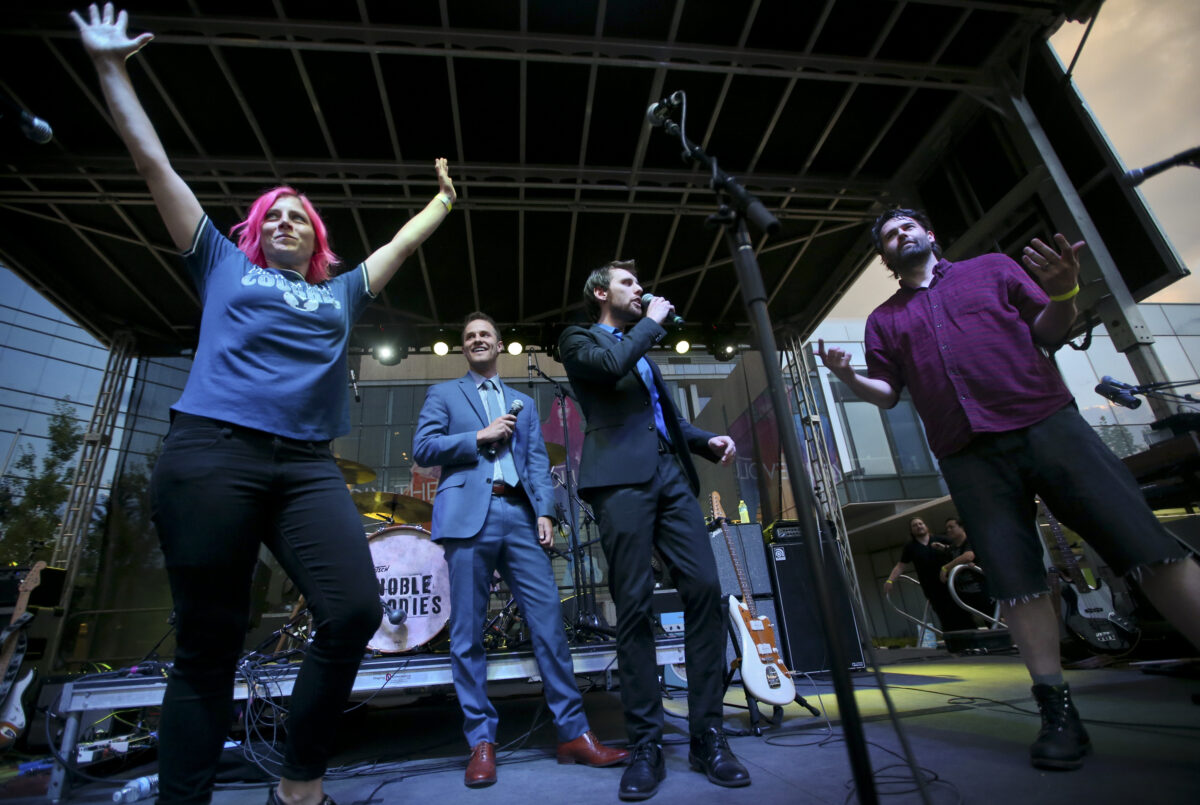 Noble Bodies' Bryce Taylor sings during the Rooftop Concert Series' battle-of-the-bands style show Friday, Aug. 3, 2018, in downtown Provo.