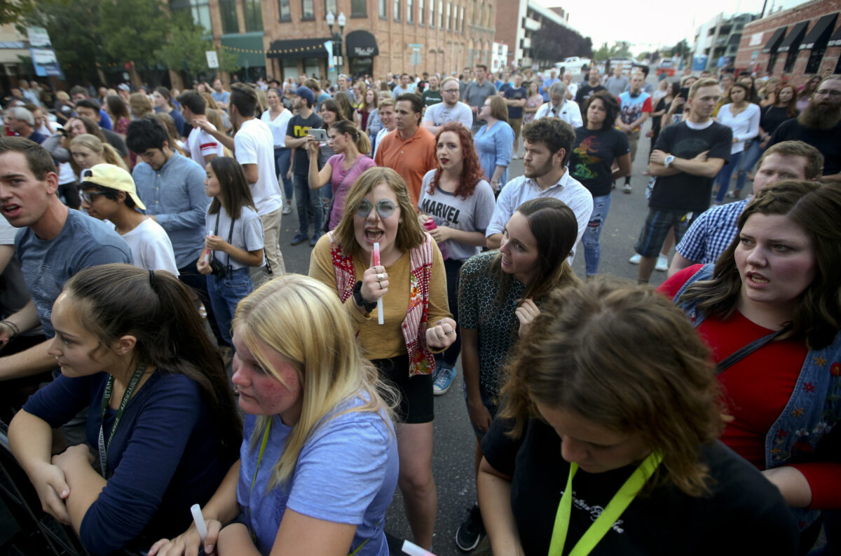 Noble Bodies' Elaine Bradley, left, and Pingiun Mofex's Nate Pyfer, right, gesture to the crowd to pump them up during the Rooftop Concert Series' battle-of-the-bands style show on Aug. 3, 2018, in downtown Provo. Local band Lantern by Sea took to the stage before Provo bands Noble Bodies and Pinguin Mofex faced off. Isaac Hale, Daily Herald