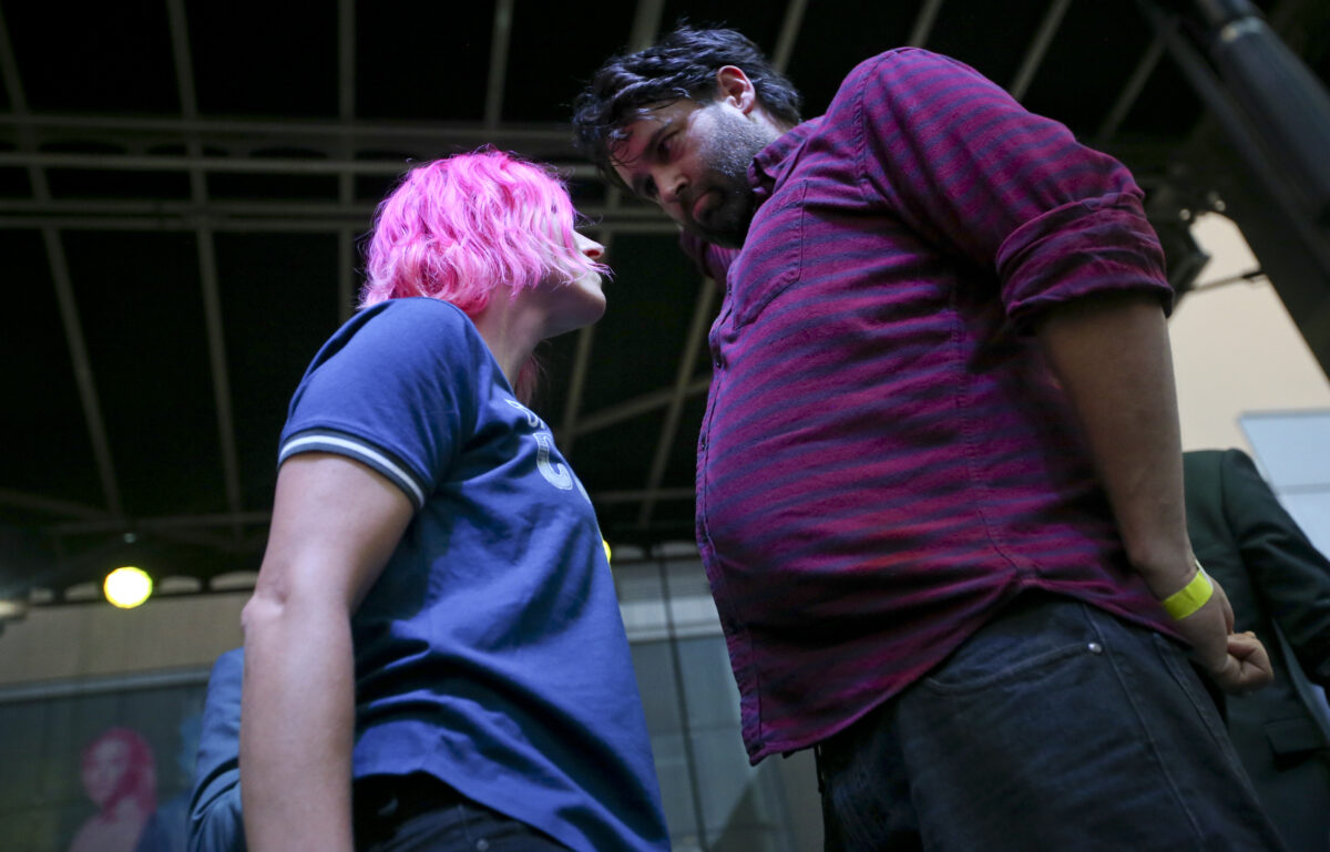 Noble Bodies' Elaine Bradley, left, and Pingiun Mofex's Nate Pyfer stare each other down during the Rooftop Concert Series' battle-of-the-bands style show Friday, Aug. 3, 2018, in downtown Provo. Local band Lantern by Sea took to the stage before Provo bands Noble Bodies and Pinguin Mofex faced off. Isaac Hale, Daily Herald