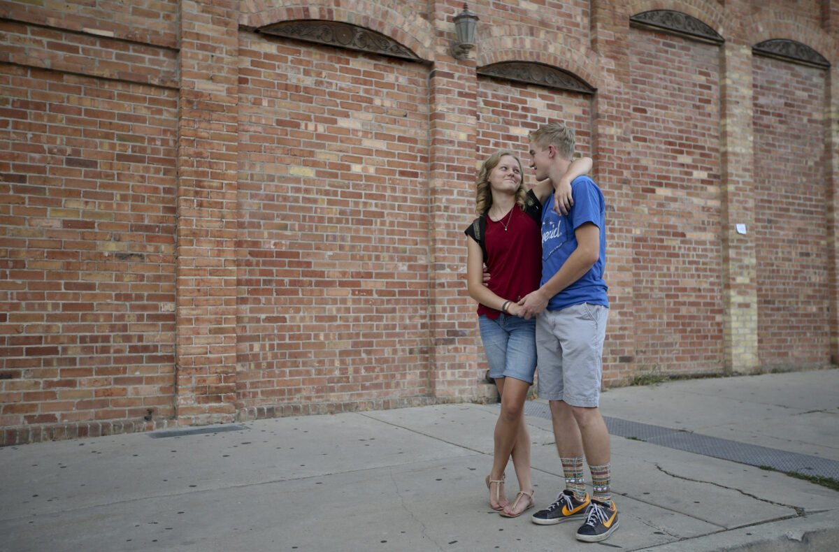 Erica Keele looks to Austin Barlow, both of Orem, as they stand together before the Rooftop Concert Series' battle-of-the-bands style show Friday, Aug. 3, 2018, in downtown Provo. Local band Lantern by Sea took to the stage before Provo bands Noble Bodies and Pinguin Mofex faced off. Isaac Hale, Daily Herald