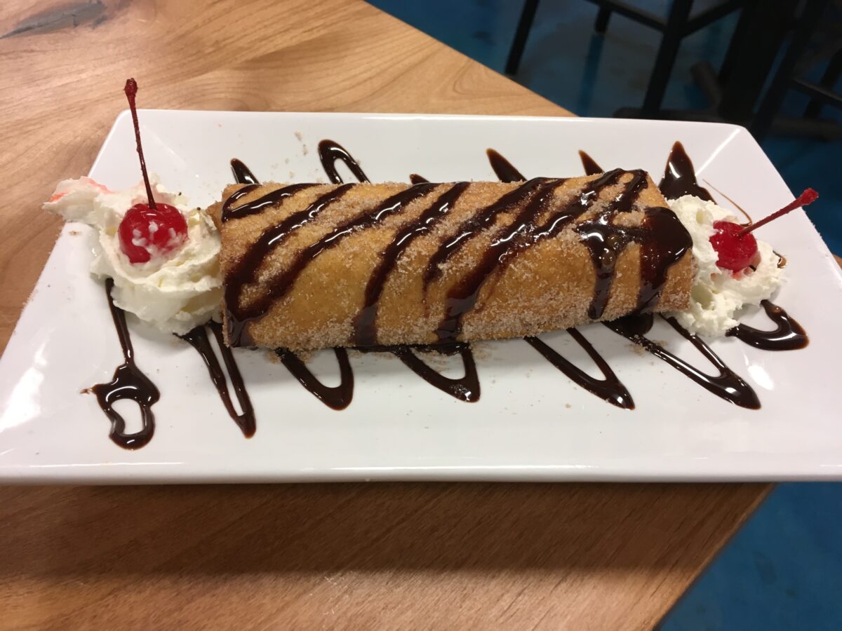 But dessert left a good taste in all of our mouths, literally. I had selected the Cheesecake Burrito — a sweet, soft, cinnamon-encased tortilla baked surrounding a rich cheesecake filling and served with chocolate syrup, whipped cream and cherries. This tasty treat proved to be a winner all around the table and ended the night on a good note.