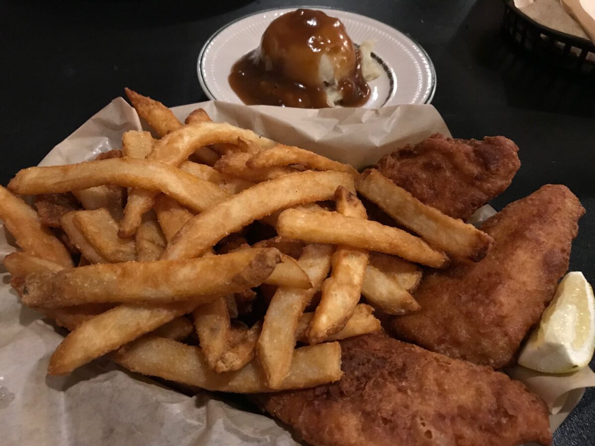 We also sampled the Fish & Chips, which are battered cod filets. There were triangular-shaped potato wedges, which we think were the actual chips mentioned in the title, but they were buried in beer-battered fries — which we think were added by accident. (We found it odd, but didn’t mind in the least.)