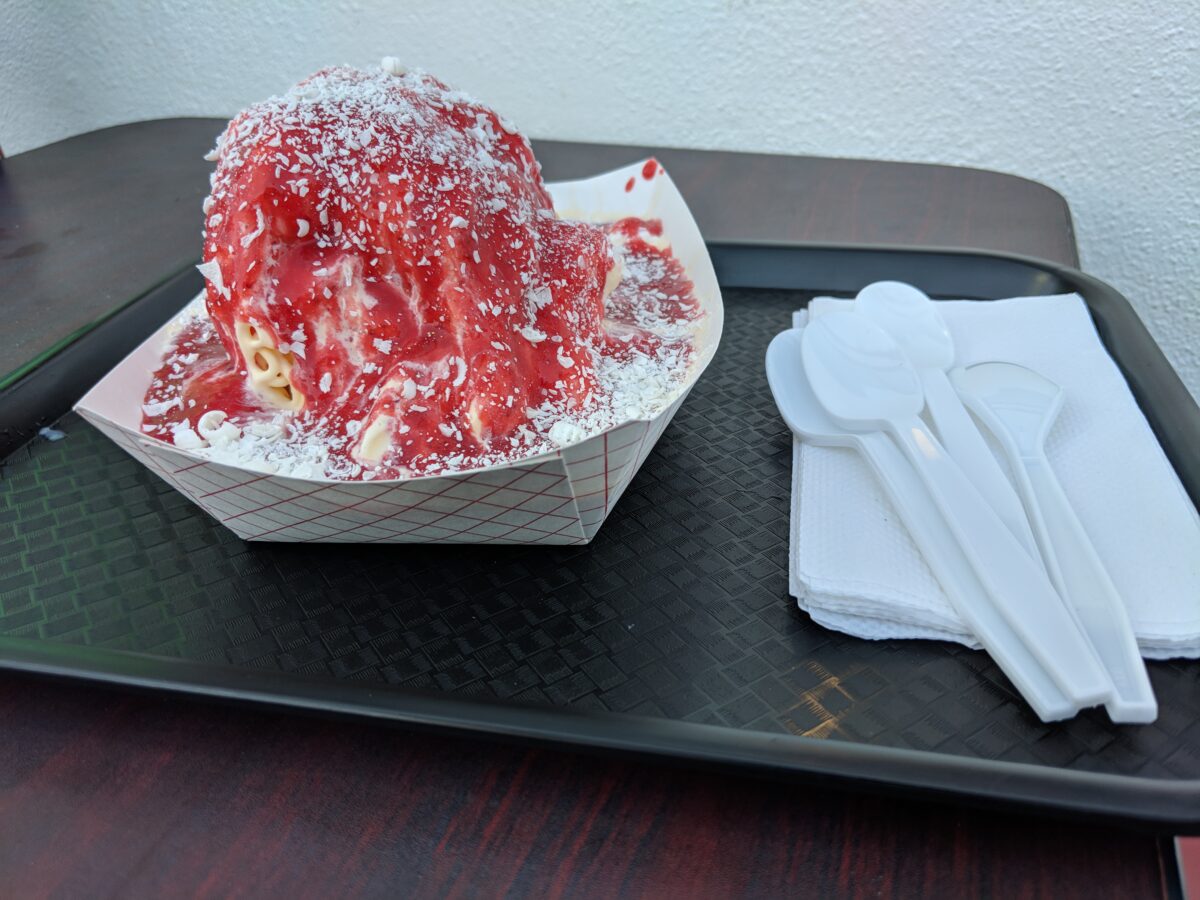 Outside of the Döner options, some of the best flavor and most fun came from Rimmels’ newest dessert offering: Spaghetti Eis. I had no idea what to expect when we ordered, but was pretty delighted when it arrived after our meal — a gigantic tower of creamy ice cream somehow shaped like spaghetti and topped with a delicious strawberry sauce and coconut flakes. Though it was melting fast in the hot sun, the dessert was such a novelty! It was a fun appearance, and our entire group dove in, savoring every sweet and flavorful bite.