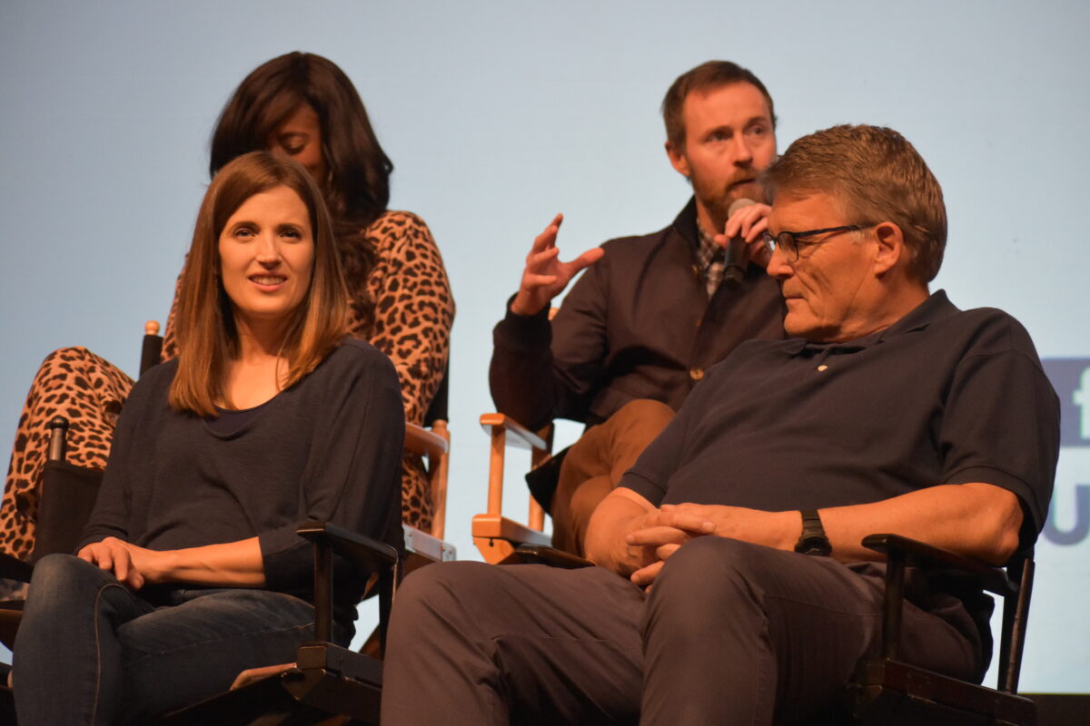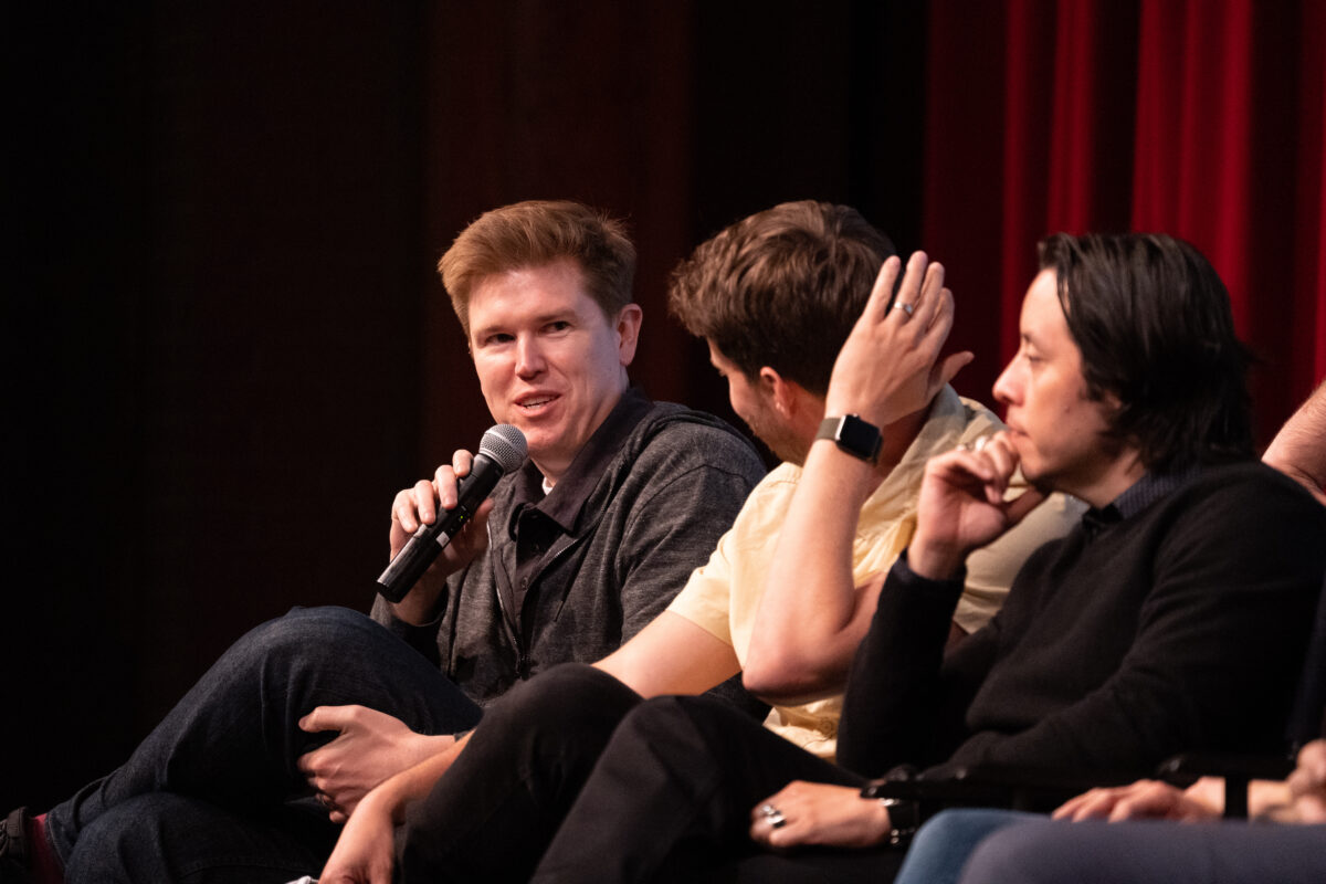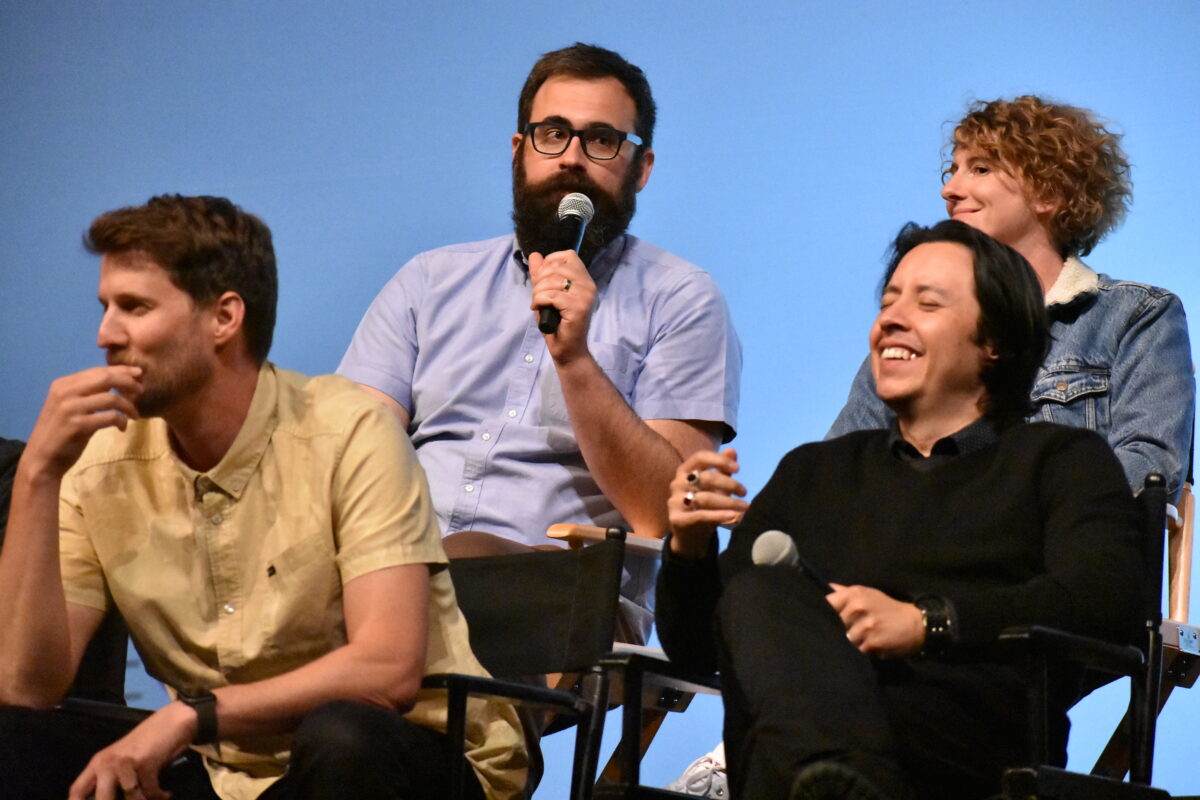 Clockwise from top right: Jerusha Hess (writer), Efren Ramirez (Pedro) and Jon Heder (Napoleon Dynamite) listen as Jared Hess (director and writer) speaks during a Q&A at the Utah Film Center's "Napoleon Dynamite" 15th anniversary screening with cast and crew at East High School in Salt Lake City on Friday, May 3, 2019.