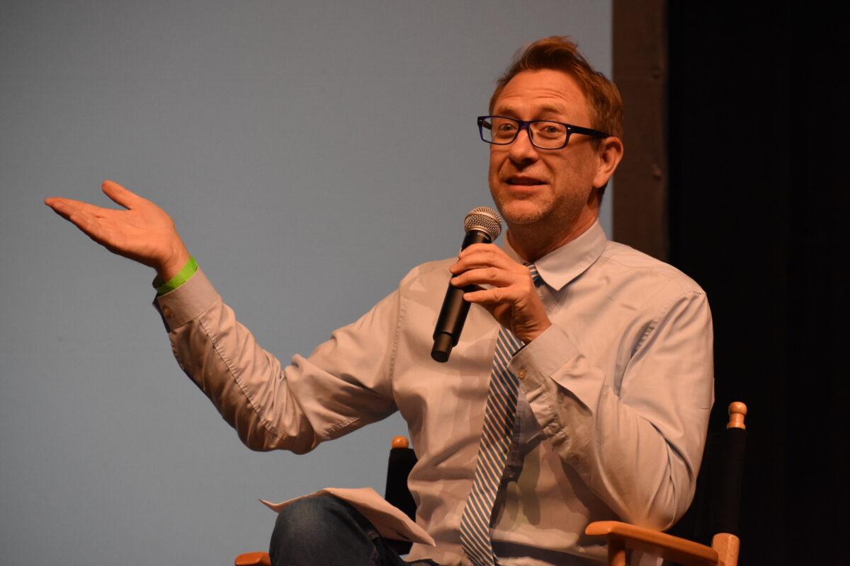 Jeremy Coon, a producer and editor for "Napoleon Dynamite," speaks during a Q&A at a Utah Film Center event celebrating the film's 15th anniversary at East High School in Salt Lake City on Friday, May 3, 2019.