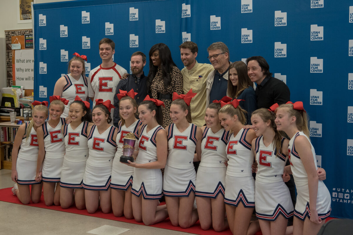East High School cheerleaders participate in a photo op with "Napoleon Dynamite" cast members on Friday, May 3, 2019, as part of a Utah Film Center event celebrating the film's 15th anniversary.