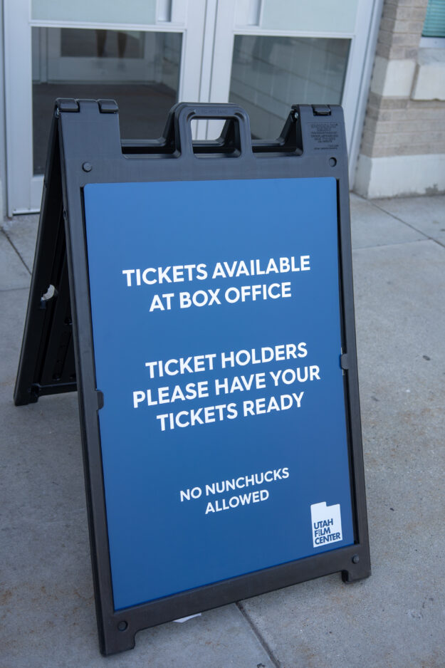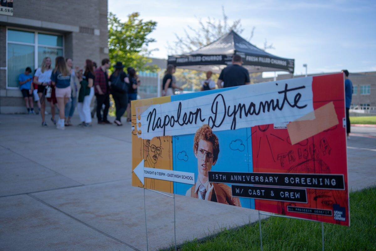 A sign for the Utah Film Center's "Napoleon Dynamite" 15th anniversary screening with cast and crew is displayed outside East High School in Salt Lake City on Friday, May 3, 2019.