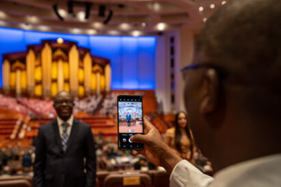 Conference-goers take a moment for a photographer prior to the Saturday session of general conference in the conference center in Salt Lake City on Saturday, April 2, 2022.
