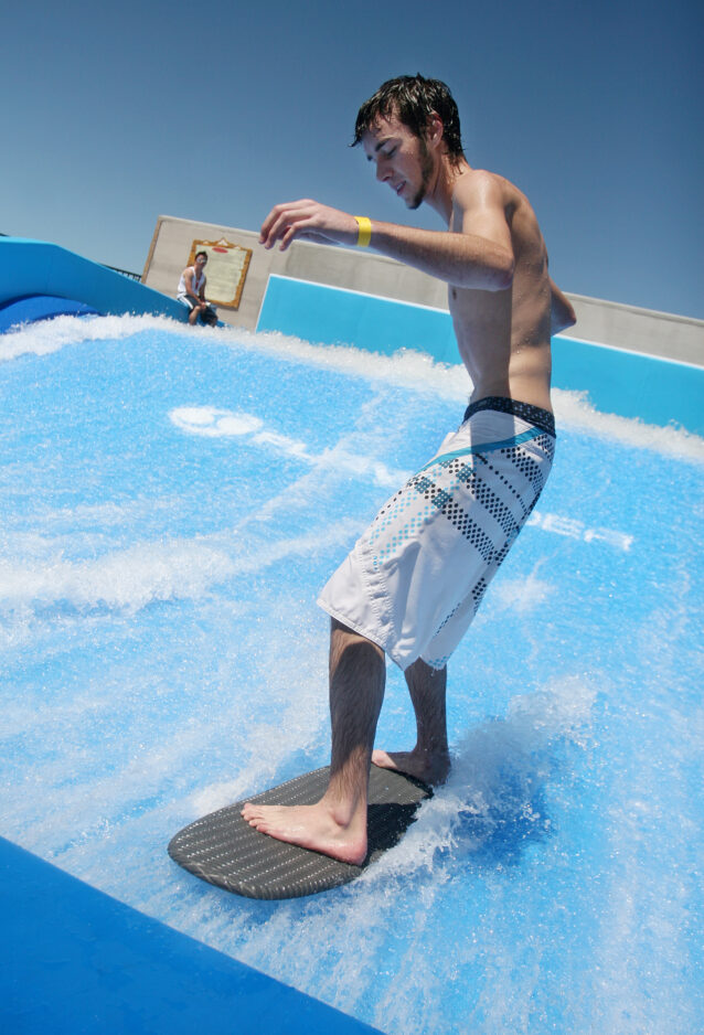 While there is no age requirement for the FlowRider, patrons must be 42 inches tall or greater to use the body board amenity and 52 inches high to use the surfboard area.