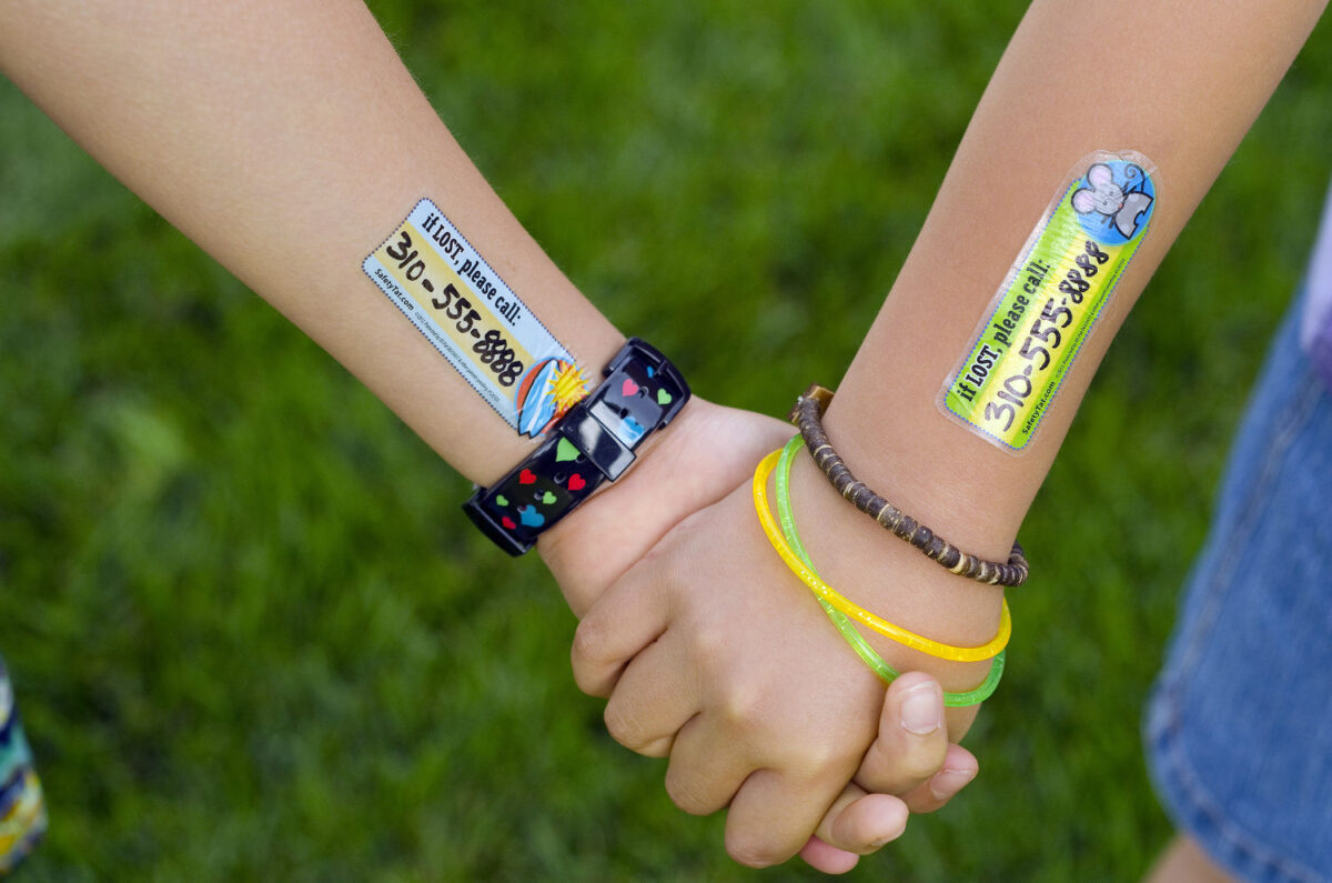 Keep phone numbers handy: Younger kids might not be able to remember their parents’ phone number; they should have your name and cellphone number written on a piece of paper and slipped into their pocket. If you want a more visible cue, try a custom temporary tattoo from SafetyTat that includes a child’s name and emergency contact information.