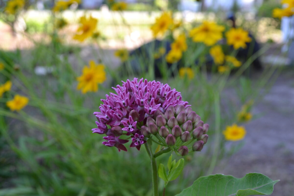 –Purple milkweed, Asclepias purpurascens. Blooms May-June with large round clusters of light to deep purple flowers. Grows two to three feet tall, likes sun and average to poor and well-drained dry soil. Showy flowers; orange aphids are common pests that can be dislodged with water sprays. Spreads with runners. Benefits butterflies, hosts monarchs. Cold hardy zones 3-9.