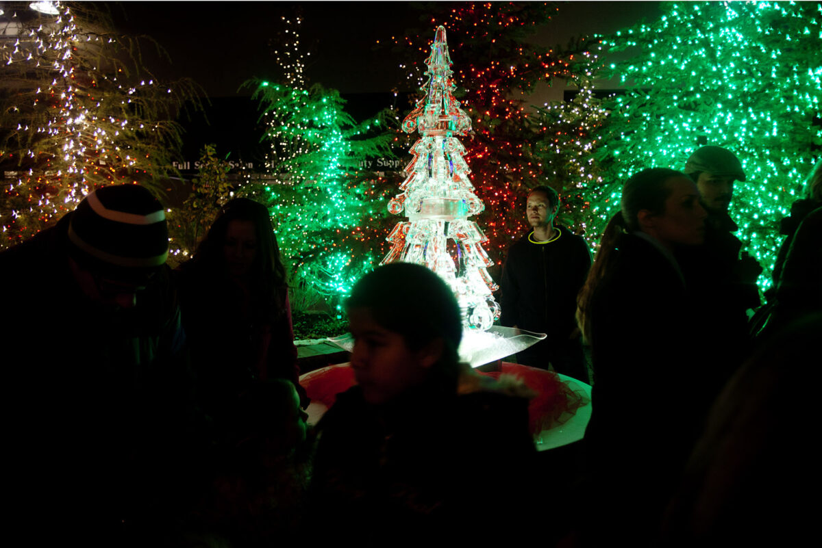 Visitors admire Christmas lights and ice sculptures during the Lighting of the Riverwoods in Provo on Friday, November 16, 2012.