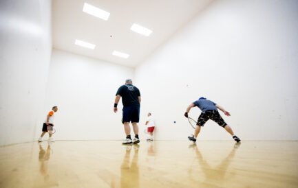 Fred Owens, of Santaquin, returns the ball as he and, from right, Craig Holland, of Lehi, Kam Broadhead, of Santaquin, and Willie Requillo, of Provo, play a game of racquetball together at the Provo Recreation Center on Thursday, June 4, 2020. Isaac Hale, Daily Herald