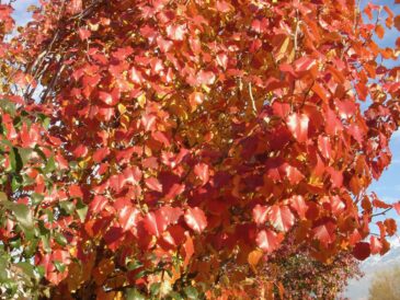 The serviceberry, usually familiar as a shrub, also exists as a tall single-trunk or multi-trunk tree. Consider varieties Autumn Brilliance (Amelanchier x grandiflora “Autumn Brilliance”) or Snowcloud (Amelanchier laevis “Snowcloud”) for showy white flowers in spring, berries, and orange-red foliage in autumn. The serviceberry may be one of the best replacements for a Bradford Pear.