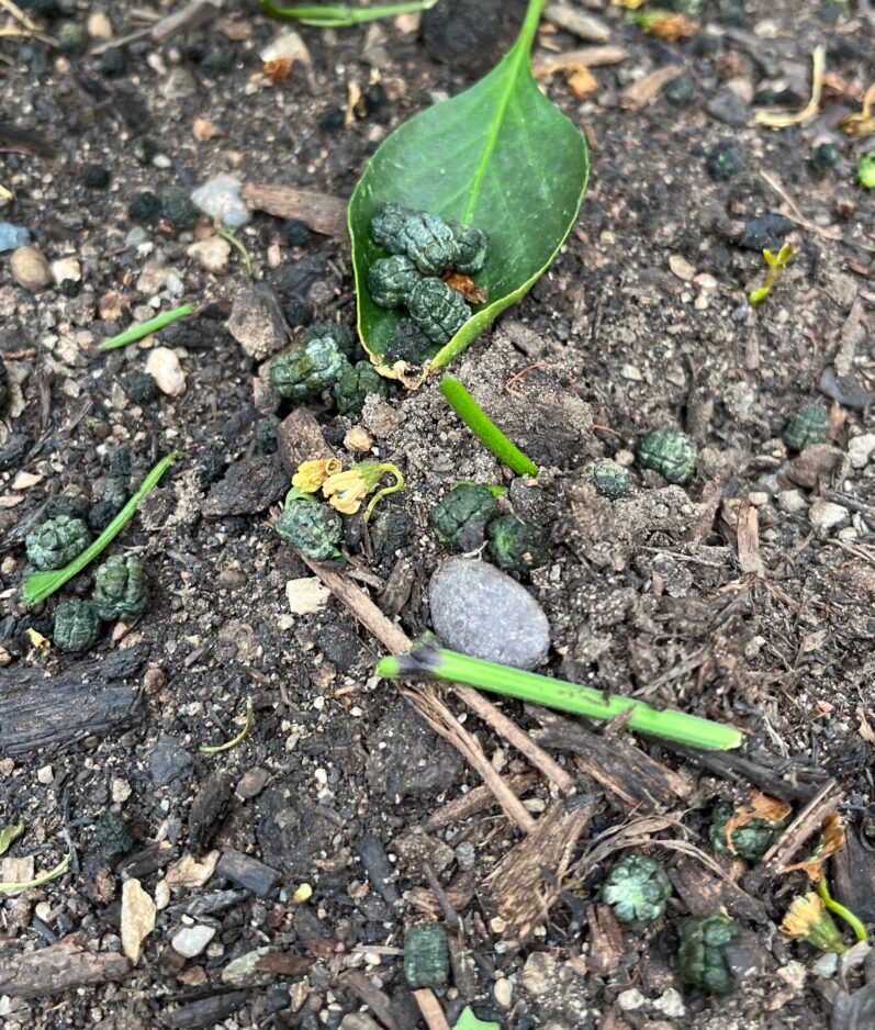 Every living thing produces some kind of waste product, whether we see it or not. Rodent droppings are usually smooth and at least somewhat oval in shape, so we should rule them out. Based on the size of the droppings, you’re probably looking for a large insect. You’ll need to be a detective and scout in your garden. Once you can find the culprit, we can narrow down a control method.