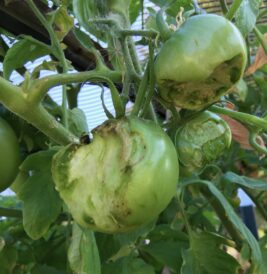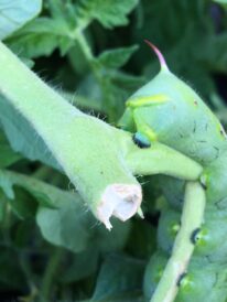 With their large size and voracious appetites, hornworms can cause a lot of damage, consuming entire leaves or small fruits. Tomato plants and their fruits are a favorite food, but they’ll also feed on peppers, eggplants and potatoes. Their frass (droppings) is sometimes the first clue that they’re in your garden, or you may notice coarse damage on fruits or entire leaves or stems missing.