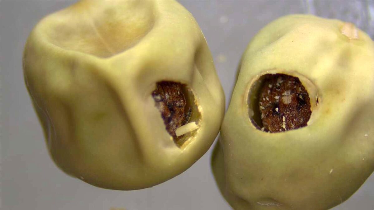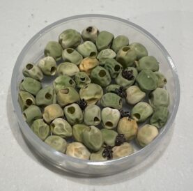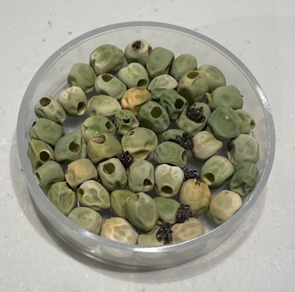 Pea weevils pupate inside individual pea seeds and make a hole when they are ready to exit the seed.