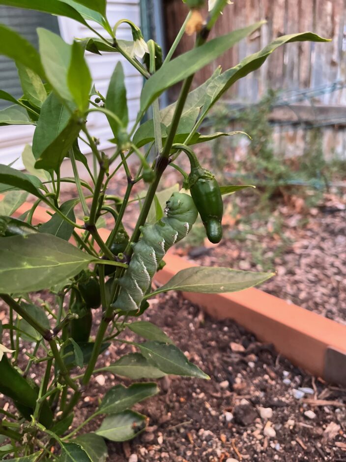 This is a hornworm. It has the markings of the Tobacco hornworm, the larval stage of a sphinx moth. The spine on their tail end gives them their common name. Hornworms start out tiny but quickly grow into the impressive-sized caterpillar you found on your pepper plant. I’m not surprised that you didn’t see it at first; they blend in with garden foliage because of their green color and often go unnoticed.