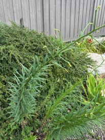 I think this plant is some kind of lily. The flower stalk is leaning out over the driveway and getting in the way. Can I cut it back now that it’s done flowering without hurting it?
