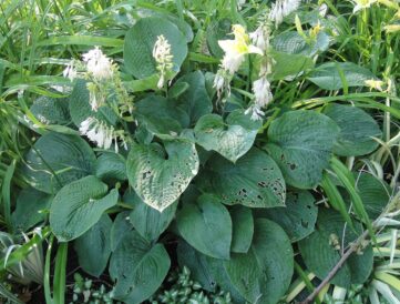 - Plants in shady, moist conditions like this Hosta are a favorite of slugs and snails. letting things dry a bit between waterings and keeping plant debris cleaned away can reduce slugs and snails.