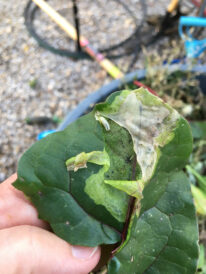 Get in the habit of inspecting your beets frequently. Look for eggs and leaf mines. Take a look at this week’s photos for examples. Eggs can be crushed by rubbing them between your thumb and finger. Leaves with leaf mines should be removed and disposed of; don’t just drop them in the garden.
